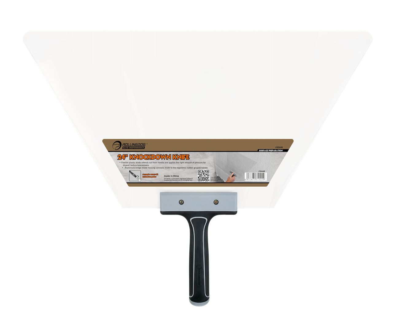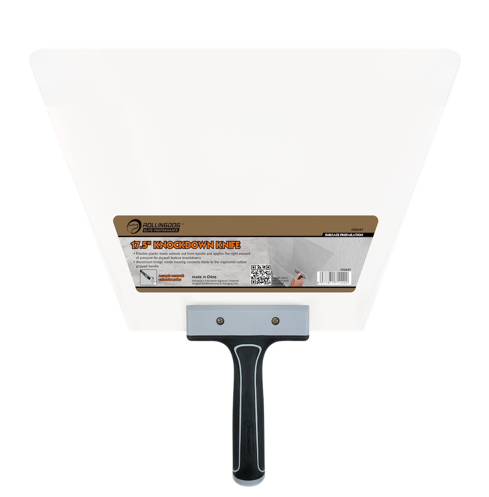 • La hoja de plástico flexible se extiende 18" desde el mango y aplica la cantidad adecuada de presión para derribar texturas de paneles de yeso.