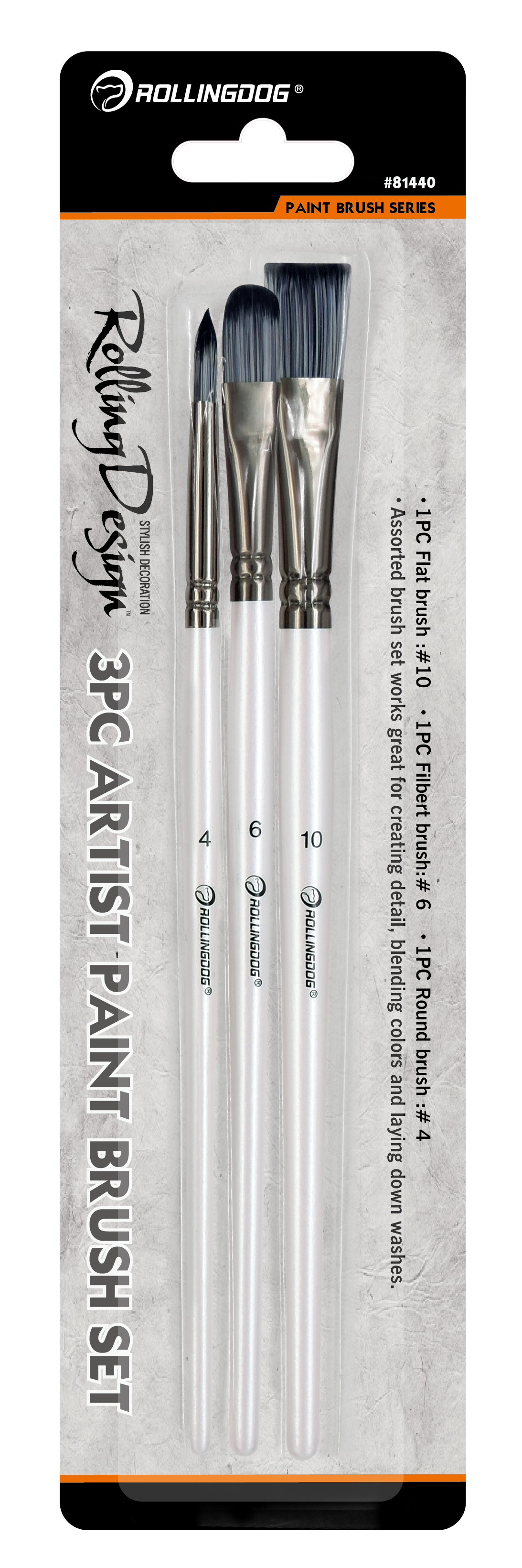 The ROLLINGDOG ROLLING DESIGN 3PC Artist Paint Brush Set is a versatile assortment designed for detail work, blending, and laying down smooth washes. This set includes a flat brush, a filbert brush, and a round brush—providing flexibility for a wide range of painting techniques. Made with high-quality synthetic filament, durable nickel-plated ferrules, and smooth coated wood handles, these brushes are ideal for gouache, watercolor, and acrylic paint.