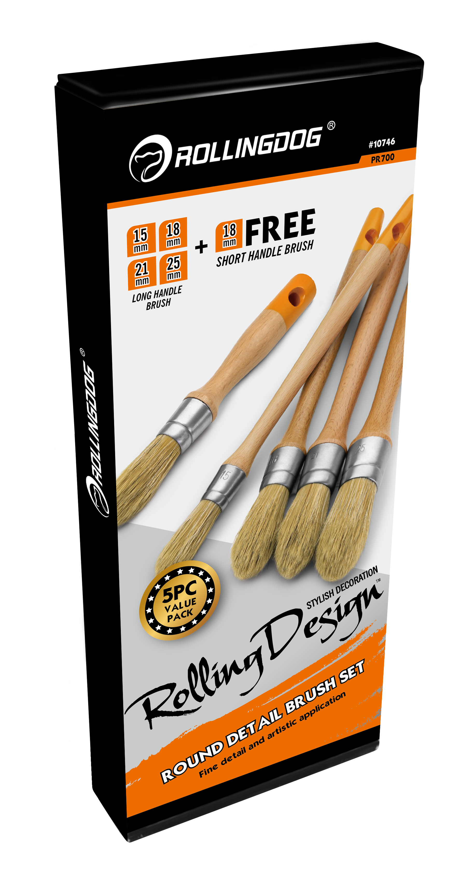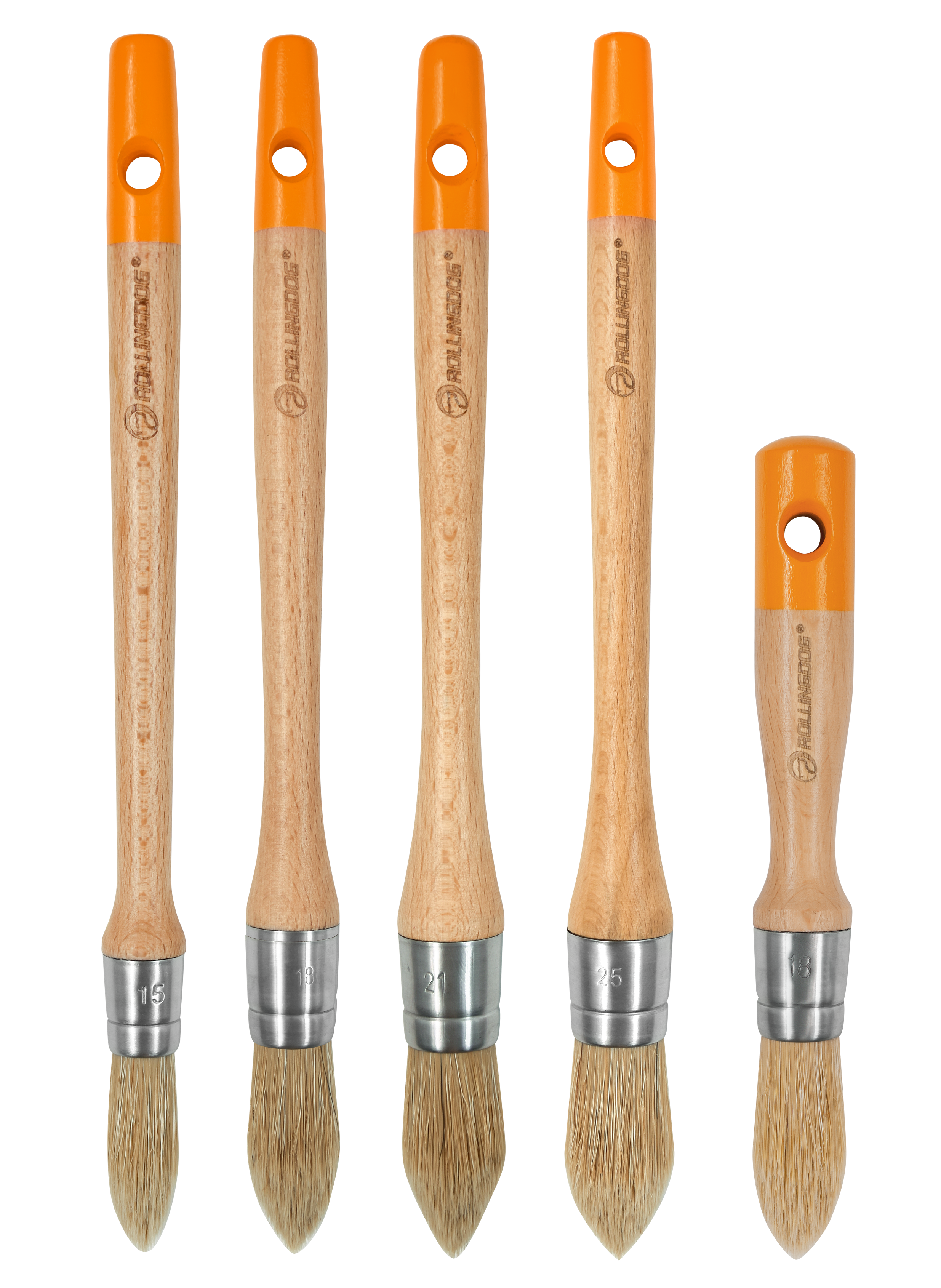 The ROLLINGDOG ROLLING DESIGN 5PC Round Detail Brush Set is a versatile, professional-quality brush kit designed for clean lines, precision control, and smooth paint application. This set includes four long-handle round detail brushes (15mm, 18mm, 21mm, and 25mm) and one short-handle 18mm brush for enhanced control in tight spaces. Built with a premium brush head blend of 30% white hog bristle and 70% solid round tapered filament, these brushes work with all paints and deliver consistent, reliable results. Finished with coated beech wood handles and stainless steel ferrules for durability and comfort.