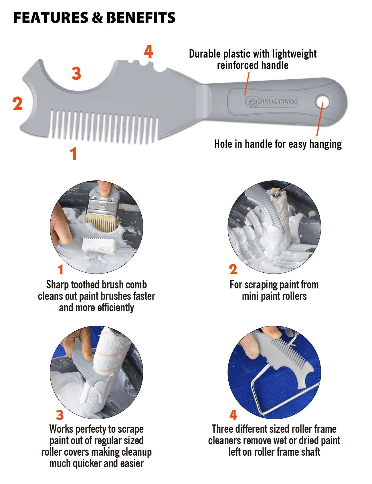 The ROLLINGDOG Brush & Roller Cleaner is a durable, reusable tool designed to quickly remove paint from brushes and roller covers. Built from sturdy plastic with a lightweight reinforced handle, this cleaner helps extend the life of painting tools while reducing cleanup time after painting projects.
