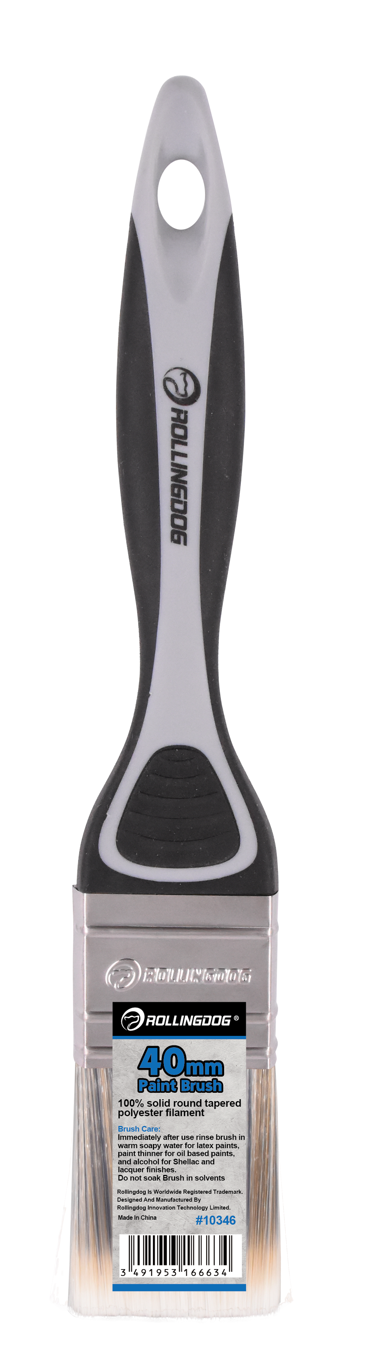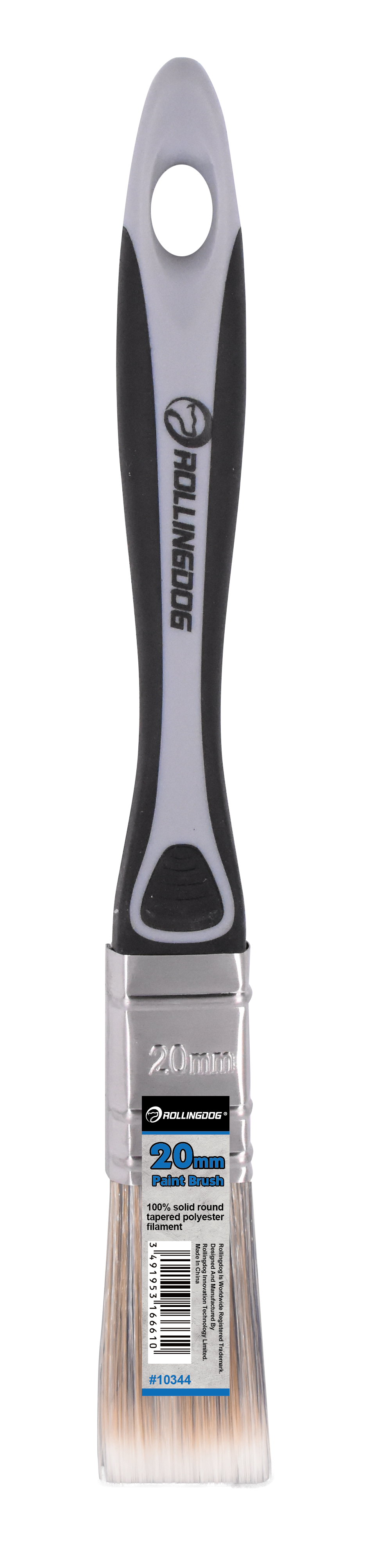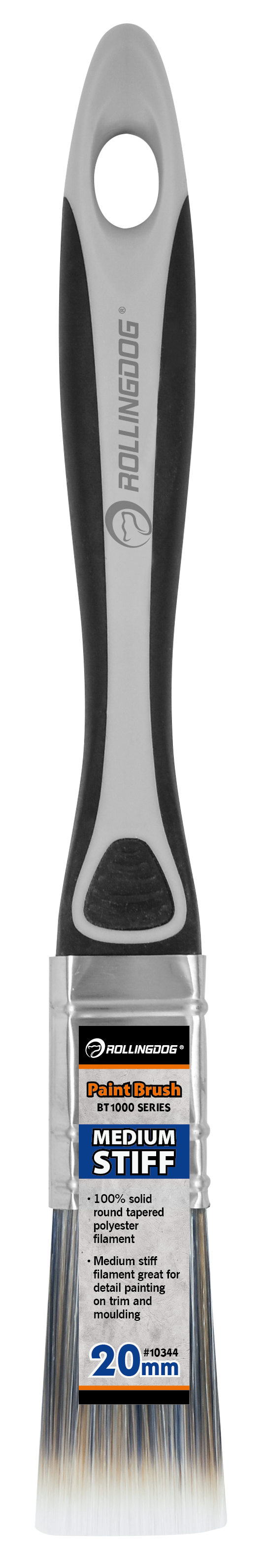 The ROLLINGDOG Paint Brush is designed for smooth, controlled application on trim, walls, and detailed surfaces. Available in sizes from 12mm to 100mm, each brush features 100% solid round tapered polyester filament for consistent paint pickup and clean release. A durable stainless steel ferrule keeps bristles secure, while the soft rubber grip handle (PP + TPE) provides comfort and control—especially during long painting sessions. Ideal for professionals and DIY projects, and works best with latex paint.