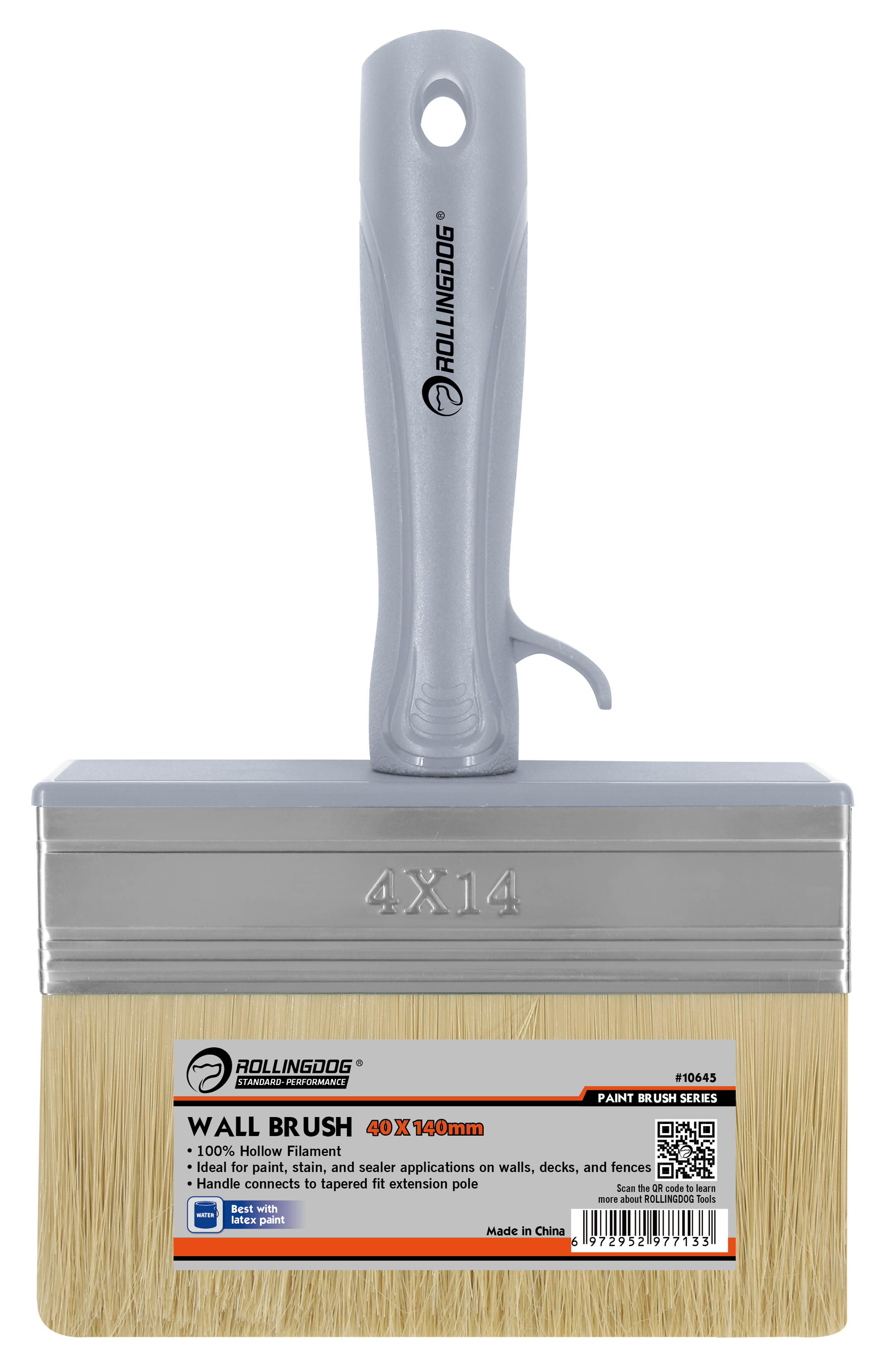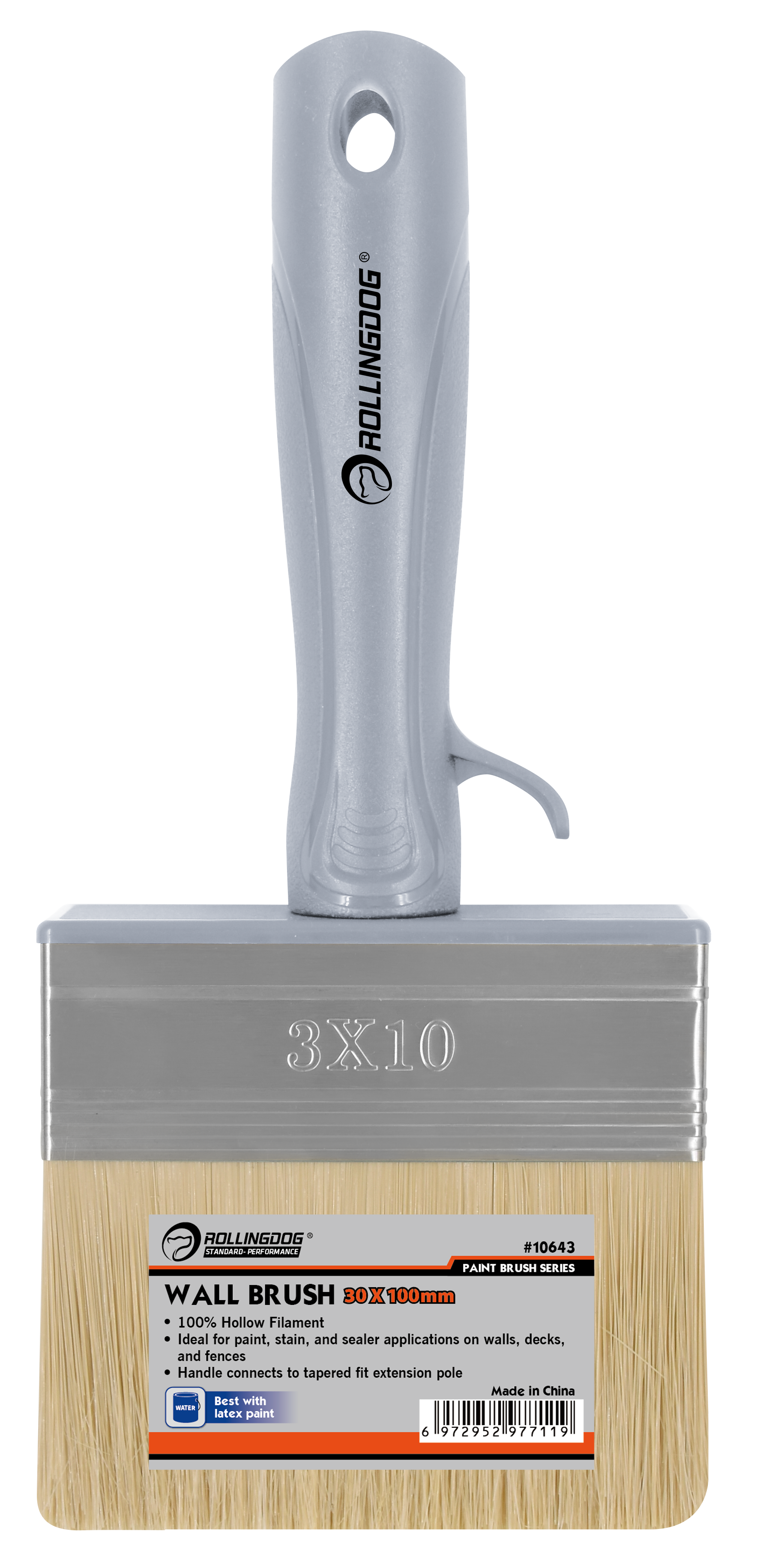 The ROLLINGDOG Wall Brush is a professional-grade applicator designed for efficient application of stains and sealers. Built with 100% hollow filament for excellent material pickup and smooth release, this brush is ideal for wall coating, sealing, and surface treatment tasks.