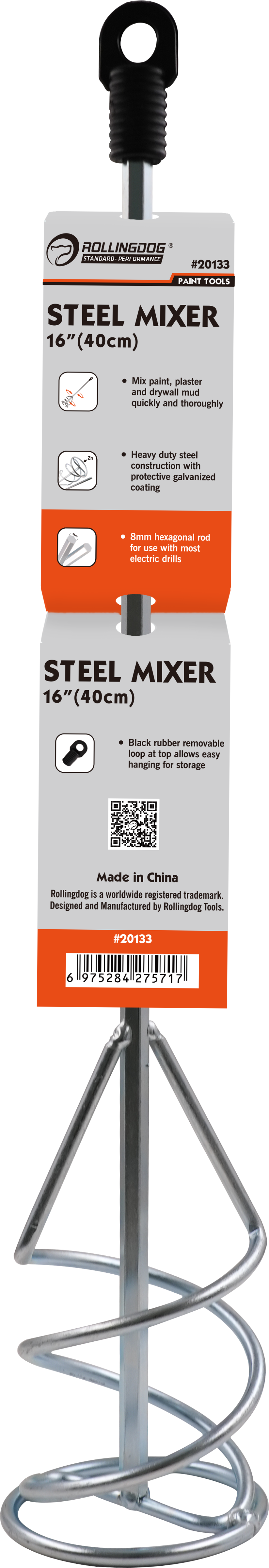 The ROLLINGDOG 16" Steel Mixer is a heavy-duty mixing tool designed for fast, thorough blending of paint, plaster, and drywall mud. Built with rugged steel construction and a protective galvanized coating, this mixer delivers durability and consistent performance for demanding job-site applications.