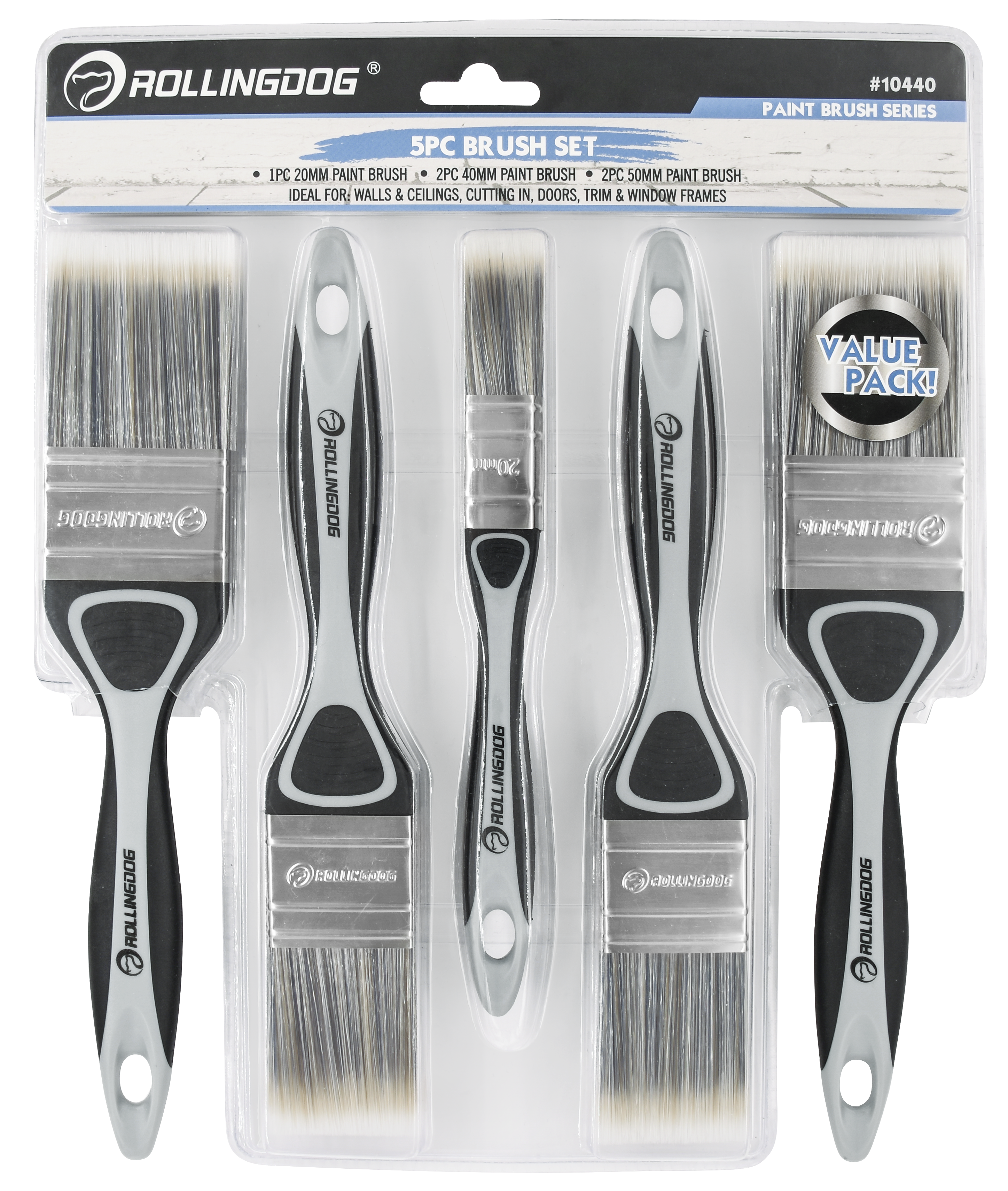 The ROLLINGDOG 5PC Paint Brush Set is a practical assortment of the most-used brush sizes for trim work and general painting. This set includes 1x 20mm, 2x 40mm, and 2x 50mm brushes—perfect for cutting-in, trim lines, and smooth coverage. Each brush features 100% solid round tapered polyester filament for consistent control, paired with a durable stainless steel ferrule and a soft rubber grip handle for comfort during longer painting jobs.