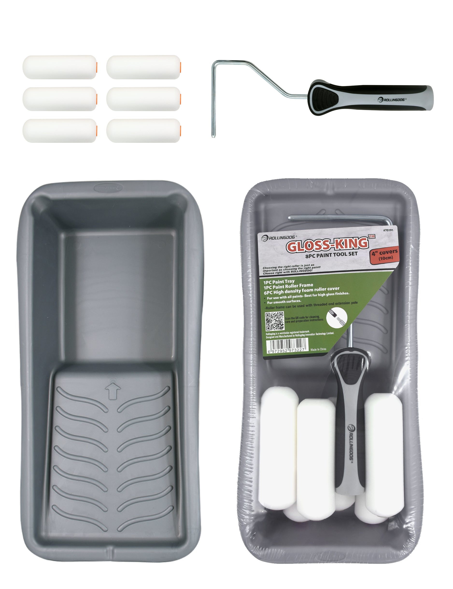 Includes 4" foam roller covers, roller frame, tray, and accessories for immediate use.