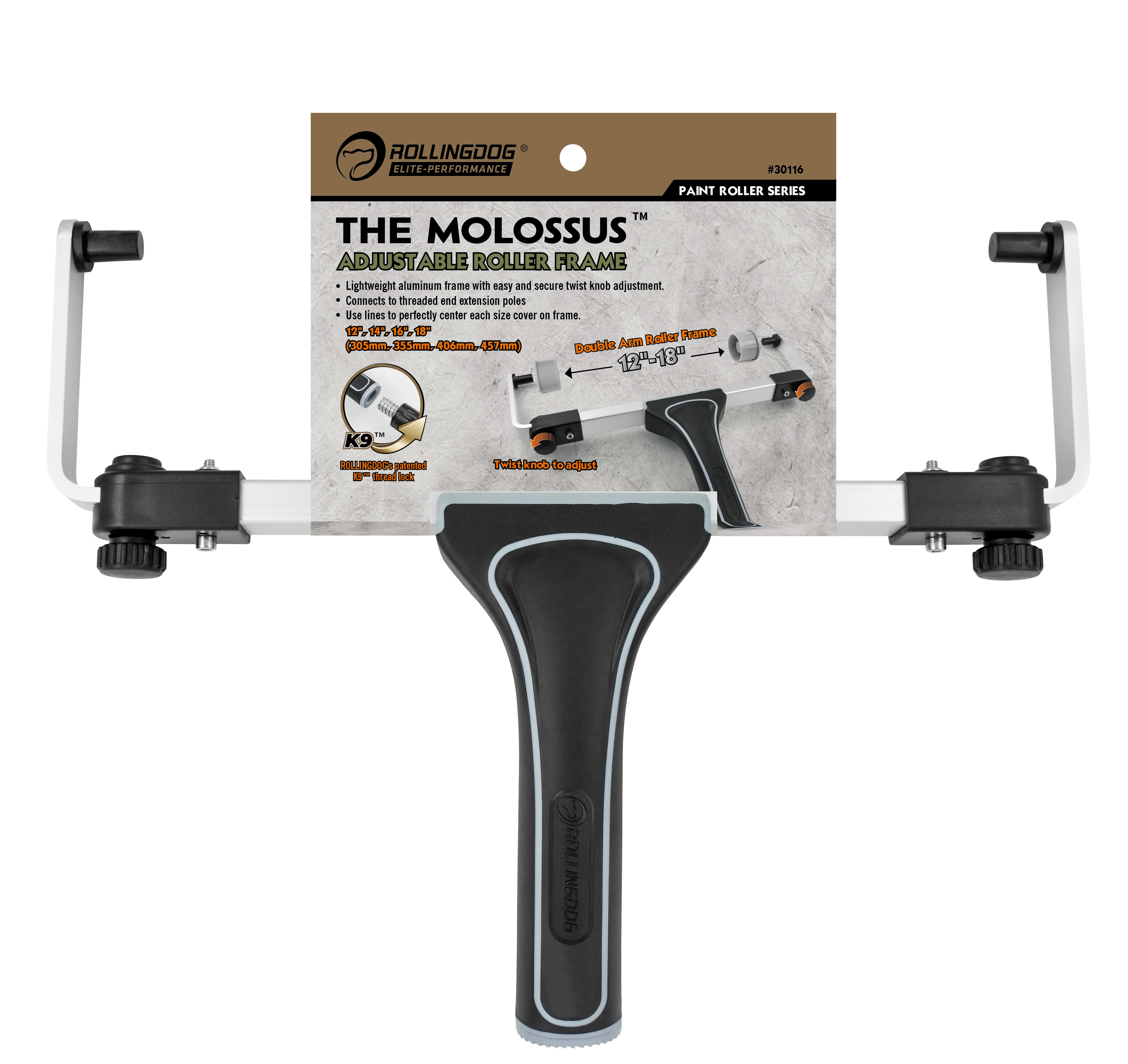 The ROLLINGDOG K9™ 12"–18" Adjustable Roller Frame is a versatile, professional-grade roller frame designed for wide-surface painting. Built with a lightweight aluminum frame and an easy twist knob adjustment system, this roller frame allows quick resizing to fit multiple roller cover widths.