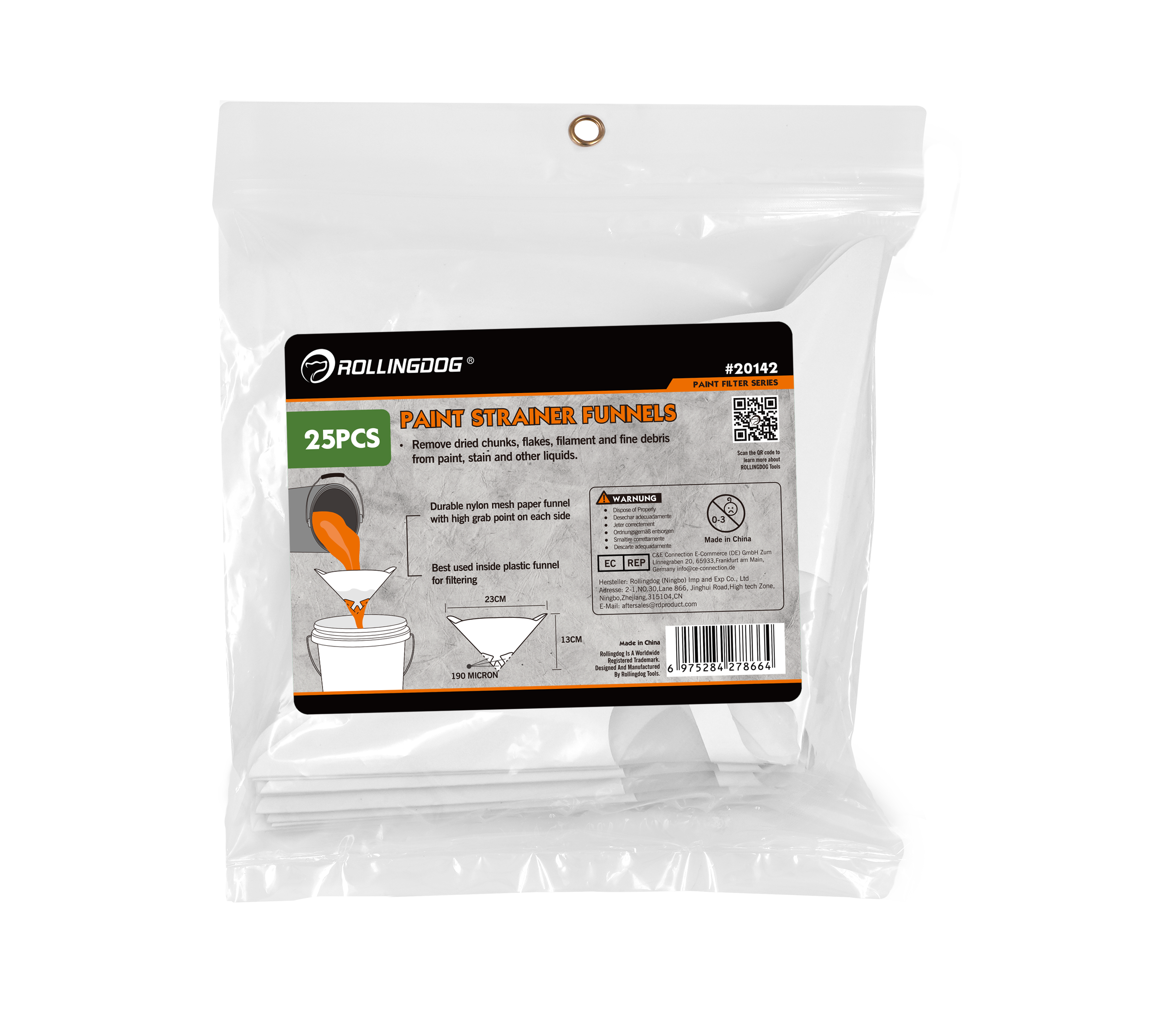 The ROLLINGDOG Paint Strainer Funnels are designed to remove dried chunks, flakes, filament, and fine debris from paint, stain, and other liquids before application. With a 190-micron filtering mesh, these funnels help ensure smooth flow, consistent finish quality, and reduced clogging when pouring into trays, buckets, or sprayers.