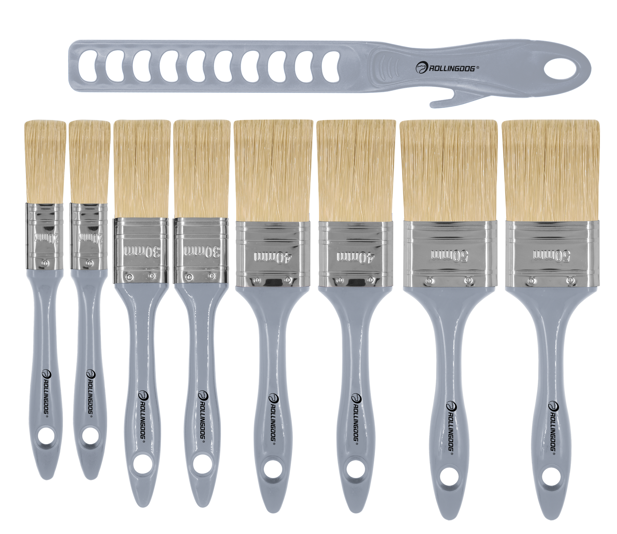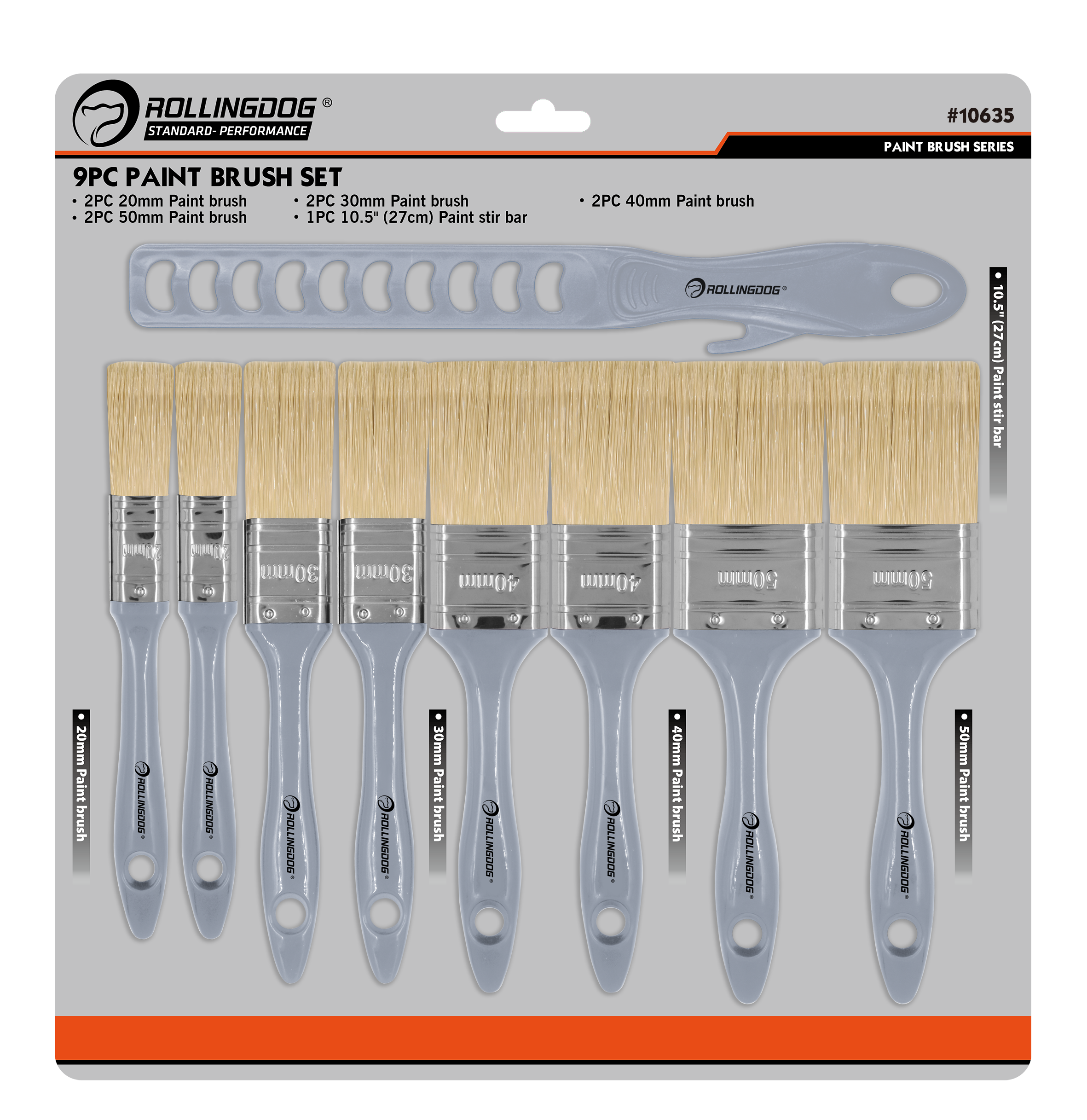 The ROLLINGDOG 9PC Paint Brush Set with Stir Bar is a value-packed brush kit designed for versatility, efficiency, and smooth paint application. This set includes eight paint brushes in four commonly used sizes plus a paint stir bar for proper paint preparation. With duplicate brush sizes included, it’s ideal for larger projects, team use, or switching between colors without stopping. Durable construction with stainless steel ferrules ensures consistent performance for both professionals and DIY users.