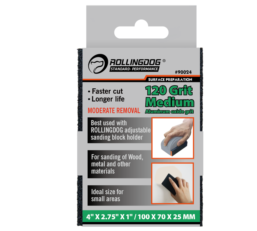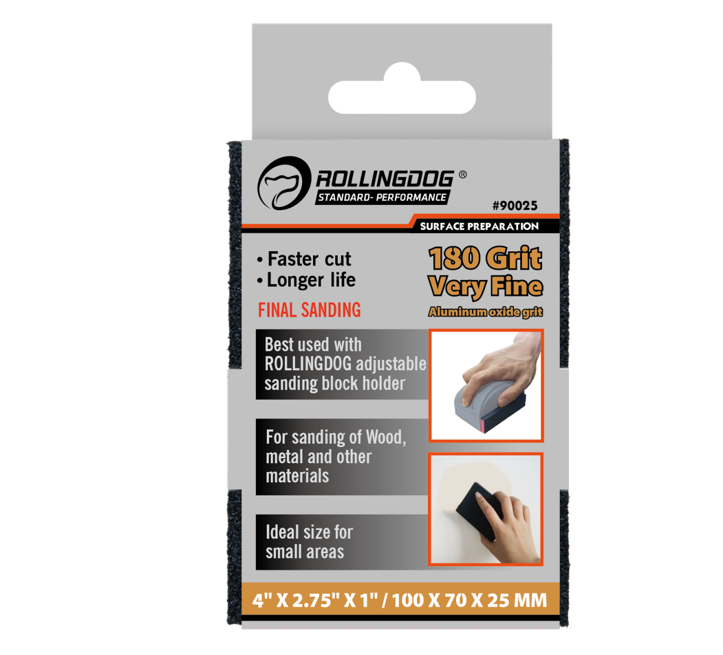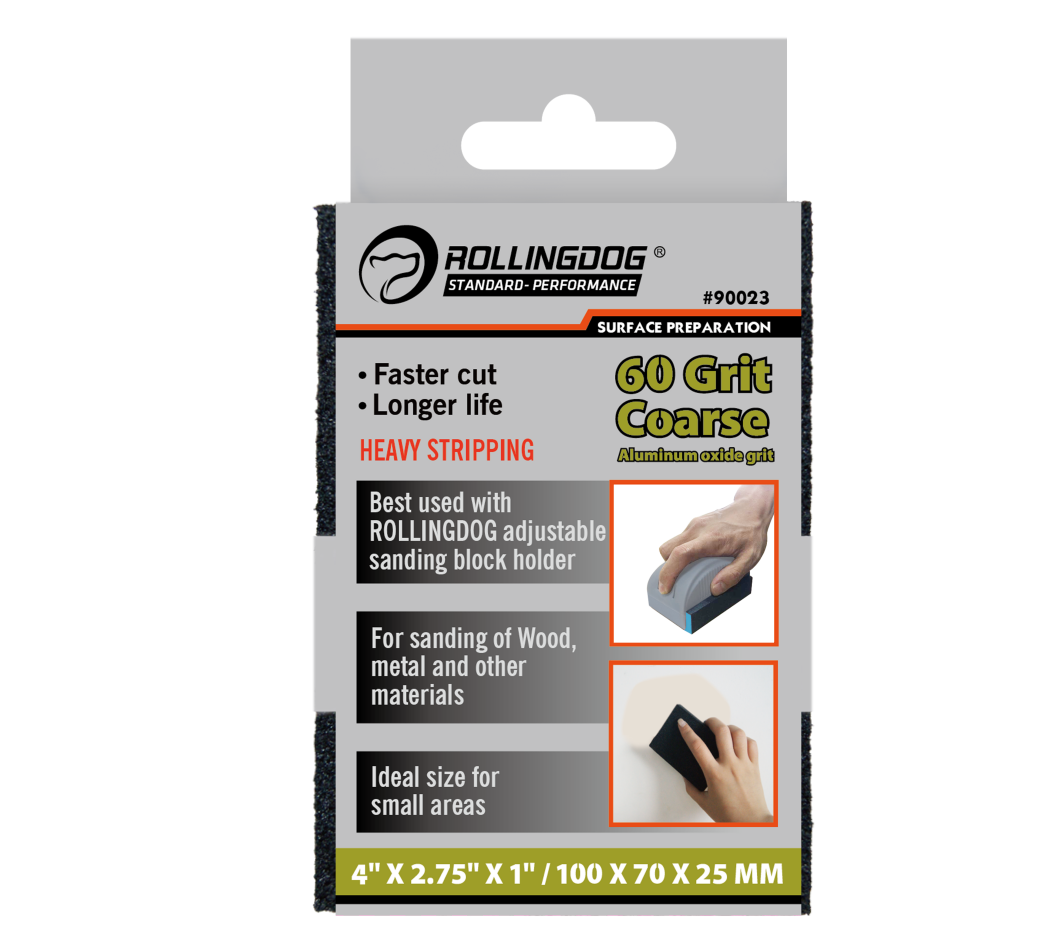 The ROLLINGDOG Sanding Sponge is a versatile sanding block designed for surface preparation, smoothing, stripping, and stock removal across a wide range of materials. Measuring 4" x 2.75" x 1", it provides a comfortable grip and consistent sanding control on flat surfaces, edges, and contoured areas. Choose the grit that matches your job—60 (Coarse), 120 (Medium), or 180 (Fine)—for the right balance of removal and finish quality.